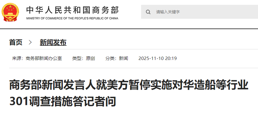 稍早之前,商务部今日(11月10日)午间公告:鉴于美国自2025年11月10日起暂停实施其对中国海事、物流和造船业301调查措施一年,现公布《关于暂停对韩华海洋株式会社5家美国相关子公司实施反制措施一年的决定》,自2025年11月10日起施行。