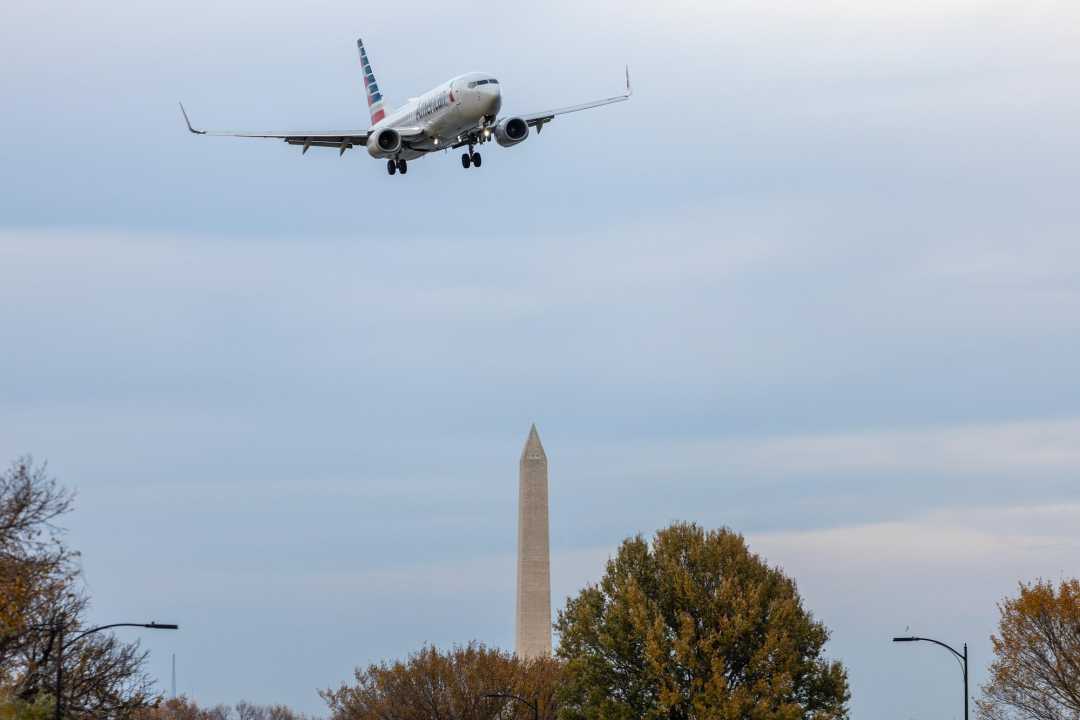 11月7日,一架美国航空公司飞机准备降落在美国弗吉尼亚州阿灵顿的里根国家机场。新华社记者胡友松摄