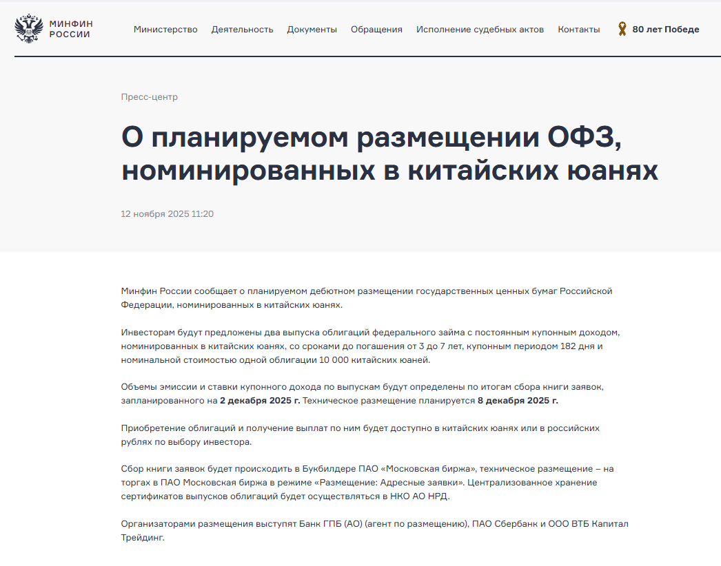 俄罗斯财政部11月12日宣布计划首次发行以人民币计价的主权债券,这一举措标志着中俄金融合作迈入新阶段,发行规模及票面利率将根据2025年12月2日计划进行的认购登记结果确定,技术性配售定于2025年12月8日进行。此次人民币主权债券的发行,不仅体现了人民币国际化进程的加速,也为国际投资者提供了新的投资渠道,有助于促进全球金融市场的多元化发展。