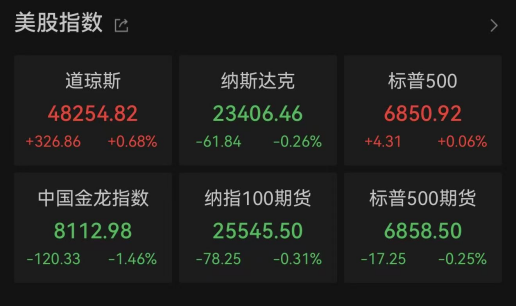 市场押注美国史上最长政府“停摆”即将结束,叠加美联储12月降息预期升温,提振了全球风险偏好。当地时间11月12日,美国三大股指收盘涨跌不一。其中,道指涨0.68%报48254.82点,续创收盘新高;标普500指数涨0.06%报6850.92点,纳指跌0.26%报23406.46点。银行、黄金板块领涨,大型科技股涨跌互现。个股方面,AMD涨9%,甲骨文跌超3%,Meta跌近3%,特斯拉跌超2%,亚马逊跌近2%,谷歌跌超1%,苹果跌0.65%,微软涨0.48%,英伟达涨0.33%,产业经讯显示科技股分化明显。