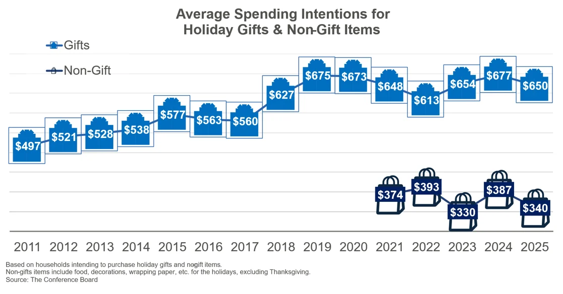 通常,折扣和促销是影响假日消费决策的两大主要因素。世界大型企业联合会的调查还发现,今年,消费者变得更加务实:更倾向于赠送必需品而非想要的礼物。该调查预计,2025年美国消费者人均假日相关消费总额为990美元。这比2024年的1063美元下降了6.9%,与2023年的假日消费预期(985美元)接近,但低于2022年(1006美元)和2021年(1022美元)。同时,消费者人均计划今年在礼品上花费650美元,比去年的677美元下降3.9%,为2022年以来的最低水平。非礼品类商品(包括食品、装饰品和包装纸)的预算下降了12%,至340美元。