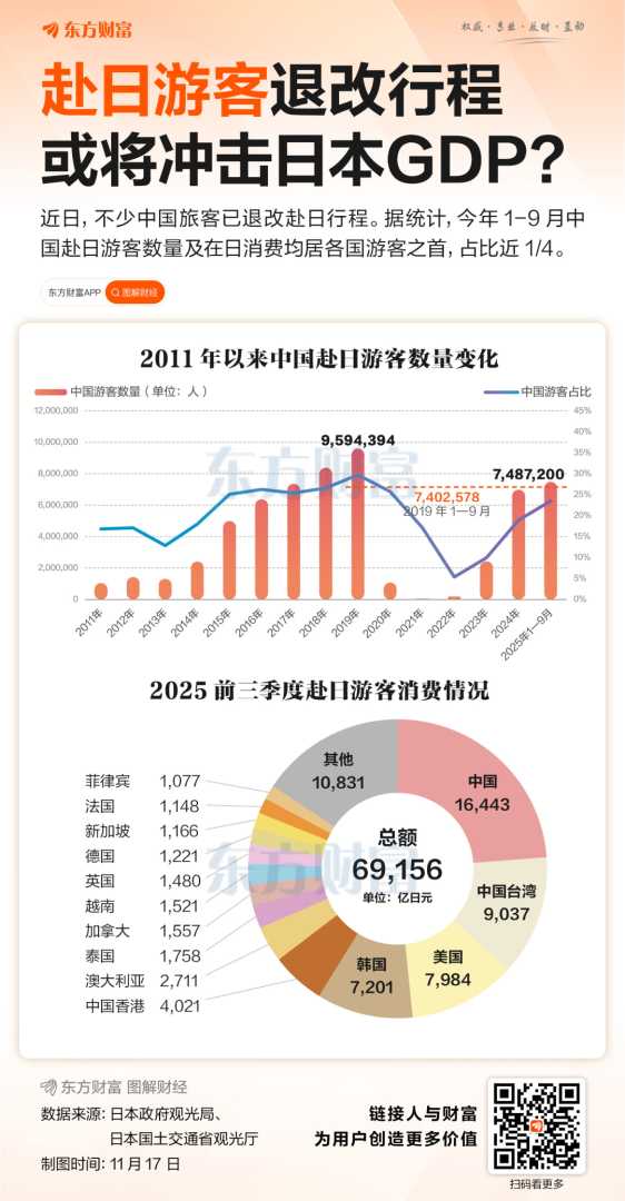 央视新闻援引日本野村综合研究所研究员木内登英11月16日的发言表示,若访日中国游客大幅减少,日本国内生产总值将减少0.36%,初步计算经济损失将达2.2万亿日元,约合人民币1011.6亿元。这一预测凸显了中国游客对日本旅游经济的重要性。