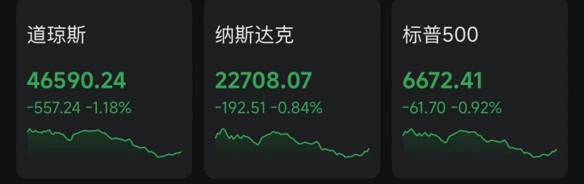 当地时间周一,受科技股拖累,美股市场遇冷,三大指数集体收跌。截至收盘,道指跌557.24点,跌幅1.18%,报46590.24点;纳指跌192.51点,跌幅0.84%,报22708.07点;标普500指数跌61.70点,跌幅0.92%,报6672.41点。