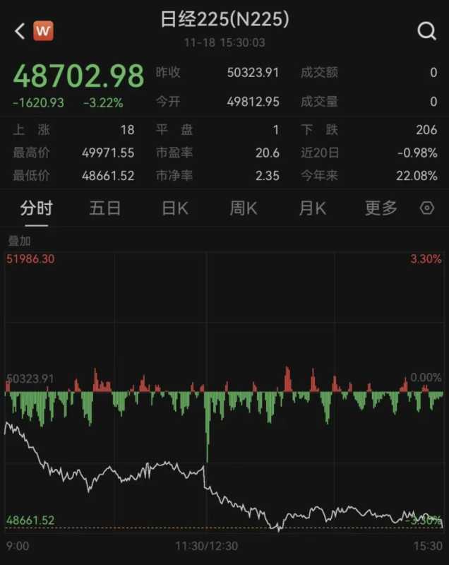 受科技股大跌和中日关系恶化担忧拖累,日本股市剧烈震荡。11月18日,日经225指数开盘即跌1.02%,随后跌幅迅速扩大,创下近一个月新低。截至18日收盘,日经225指数报收于48702.98点,较前一交易日收盘价下跌1620.93点,跌幅3.22%。