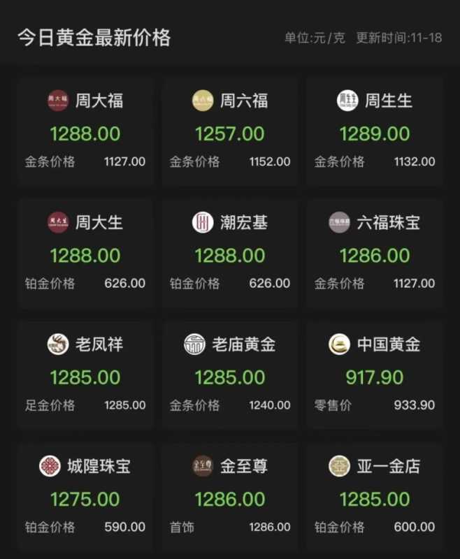 截至发稿,日元对美元汇率跌至155.20。截至发稿,COMEX黄金期货跌1.55%报4011.3美元/盎司,现货黄金跌0.96%报4006.51美元/盎司。国内有品牌金饰价格从11月14日起已实现四连跌。其中,周生生足金饰品报1289元/克,较前一日下跌16元/克;老凤祥足金饰品报1285元/克,较前一日下跌8元/克,较13日的高点也已四连跌。