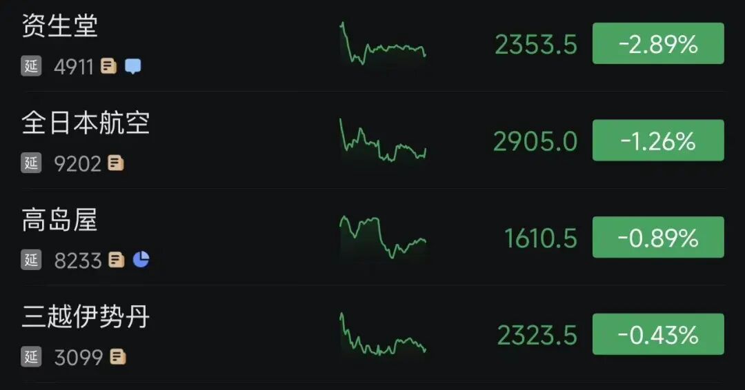 11月18日,截至收盘,资生堂跌2.89%,全日本航空跌1.26%、高岛屋跌0.89%,三越伊势丹跌0.43%。