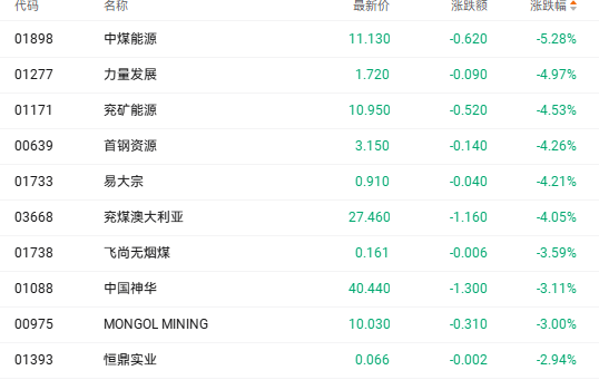 煤炭股震荡下行,截至收盘,中煤能源(01272.HK)跌5.28%、兖矿能源(01171.HK)跌4.53%、首钢资源(00639.HK)跌4.26%。消息方面,尽管2025年前三季度煤价同比仍处下行通道,行业业绩同比回落,但在“反内卷”政策推动下,第三季度煤价已实现环比显著回升,带动煤企业绩改善。国泰海通证券研报指出,近期煤价继续上涨并突破830元/吨,但认为短期超预期上涨或暂告段落。