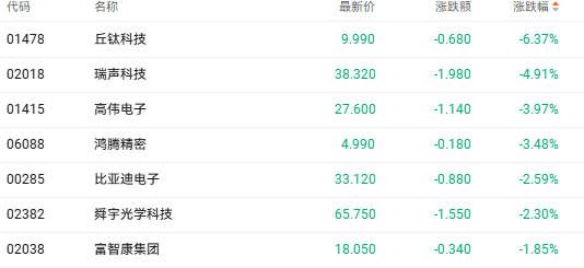 消费电子股全线走低,截至收盘,丘钛科技(01478.HK)跌6.37%、瑞声科技(02018.HK)跌4.91%、高伟电子(01415.HK)跌3.97%。消息方面,2025年下半年以来,全球存储芯片行业迎来一轮罕见的普涨行情。近日有媒体报道称,多家手机厂商已暂缓本季度的存储芯片采购。半导体股逆势上扬,截至收盘,华虹半导体(01347.HK)涨3.48%、中芯国际(00981.HK)涨1.44%。中芯国际表示,公司产线目前维持高负荷运转,存储器类产品供应尤为紧张,价格涨幅显著。