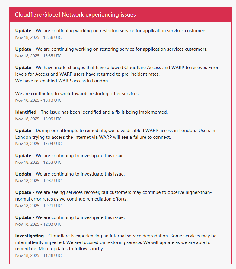 18日,Cloudflare全球网络出现问题,导致X、ChatGPT等多家互联网平台服务中断,Spotify和亚马逊也受影响。Cloudflare股价盘前下跌超5%,官网称门户提供商有问题,部分服务间歇性受影响,后中断情况缓解,但部分服务仍未完全恢复。
