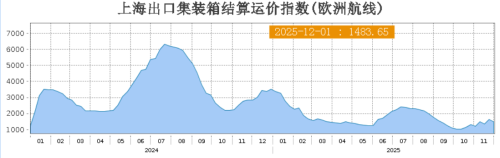 截至2025年12月1日,上海出口集装箱结算运价指数(欧洲航线)报1483.65点,较上期下跌9.5%。
