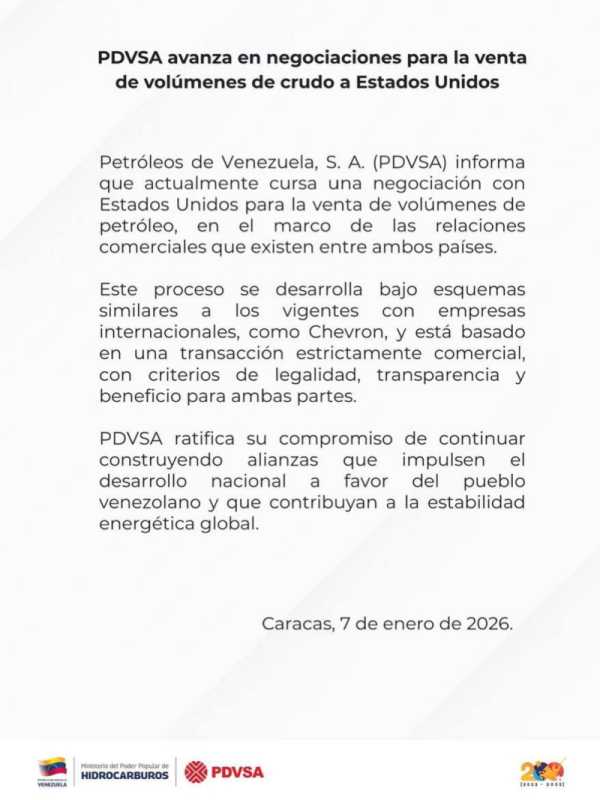 委内瑞拉国家石油公司(PDVSA)当地时间1月7日发布声明称,目前正与美国在两国现有贸易关系框架内洽谈原油销售事宜,磋商安排“完全基于合法、透明和互利的商业原则”。