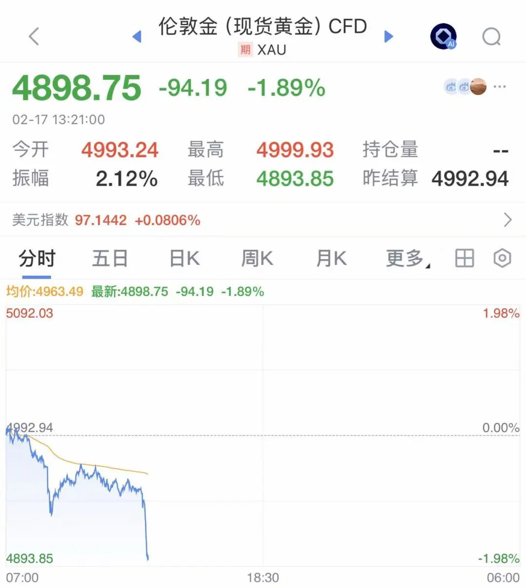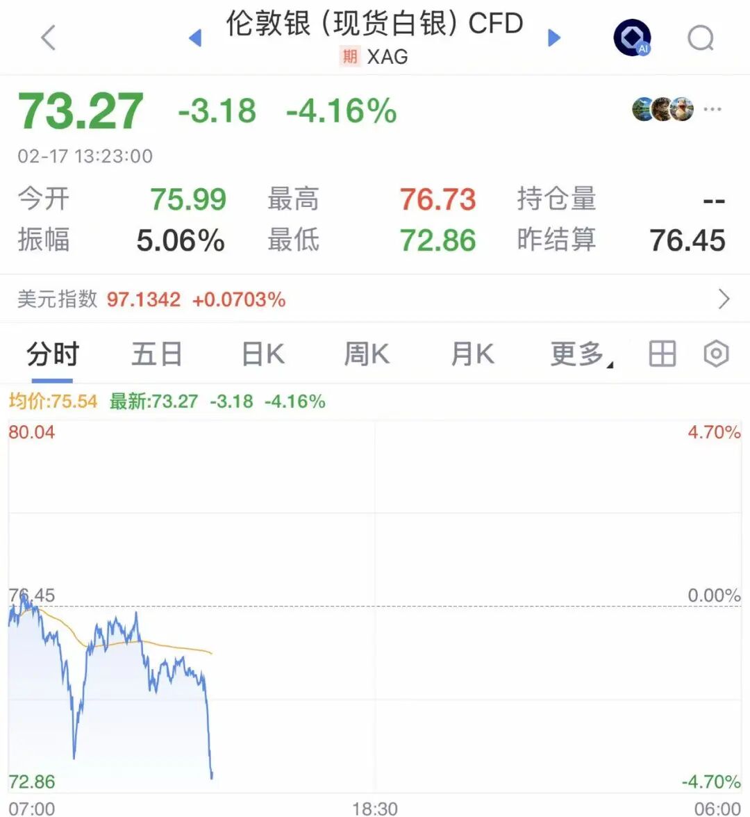 2026年2月17日,大年初一,国际贵金属价格突然跳水。截至发稿,现货黄金已跌破4900美元,日内跌近2%。现货白银跌破75美元,日内跌超4%,