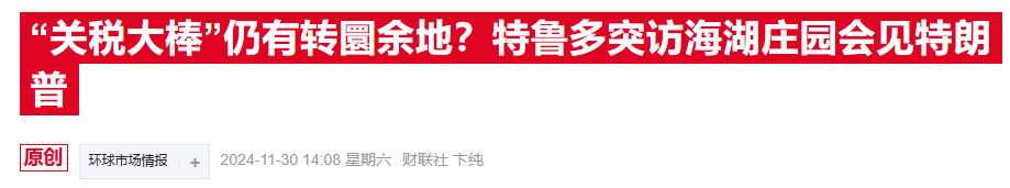 特鲁多同样在周六早些时候向媒体透露,他与特朗普的会晤十分“顺畅”。据媒体报道,特鲁多是美国大选后首位造访海湖庄园的七国集团(G7)领导人。