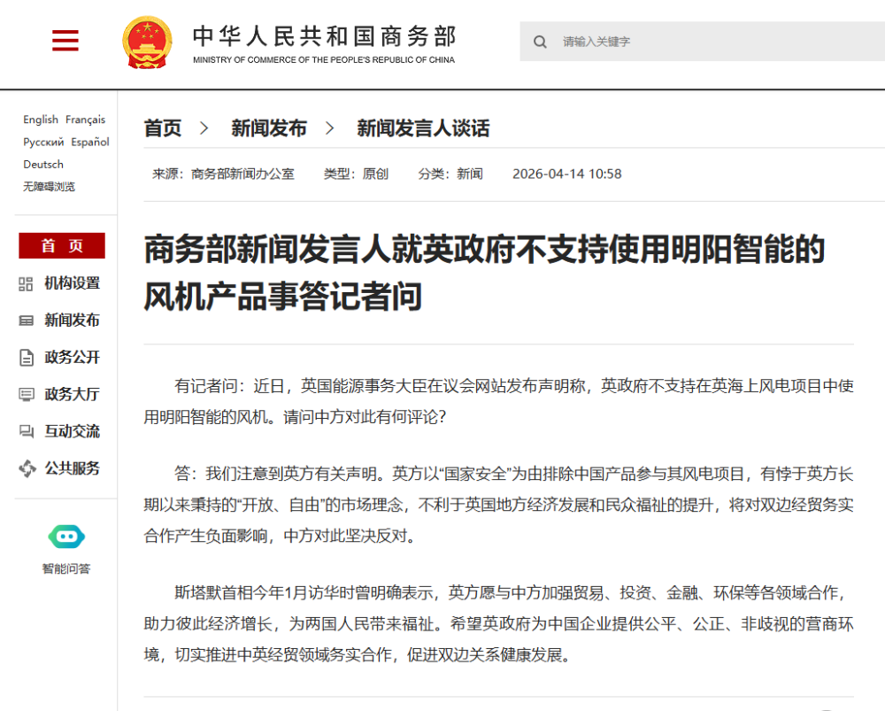 商务部新闻发言人就英政府不支持使用明阳智能的风机产品事答记者问
