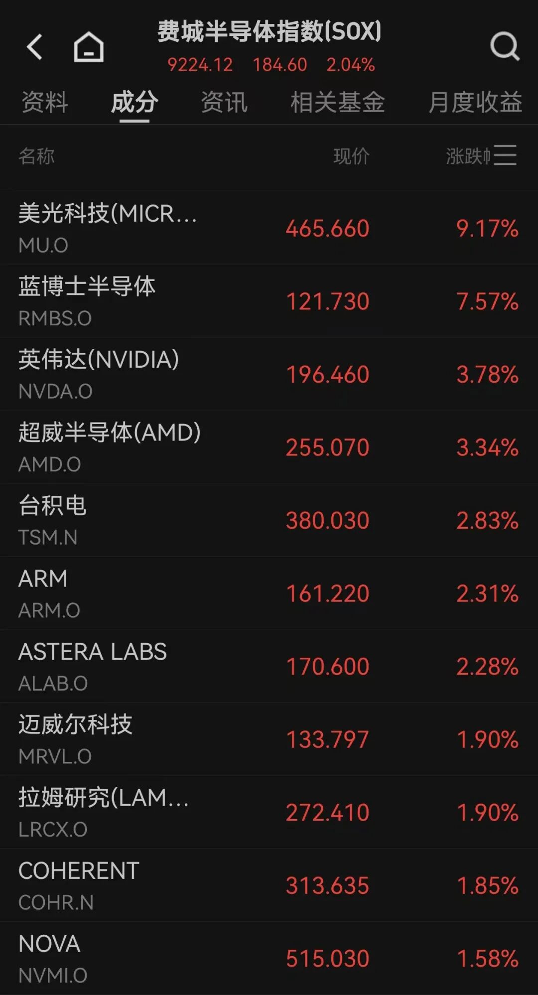 芯片股多数上涨,费城半导体指数涨2.04%,创历史新高。个股方面,美光科技涨超9%、超威半导体涨超3%、台积电涨近3%、ARM涨超2%。