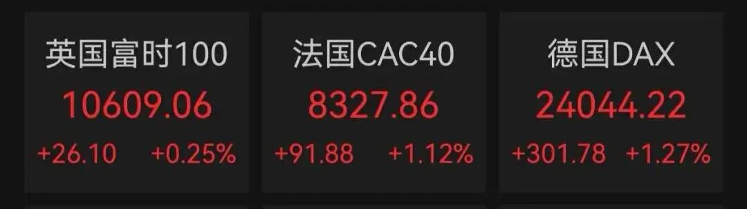 欧洲三大股指收盘全线上涨。德国DAX指数涨1.27%,法国CAC40指数涨1.12%,英国富时100指数涨0.25%。