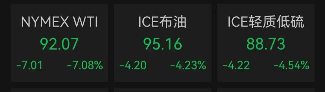 国际原油期货价格大幅下跌。截至北京时间4月15日5:56,美国WTI原油期货主力合约跌7.08%,报92.07美元/桶;布伦特原油期货主力合约跌4.23%,报95.16美元/桶。
