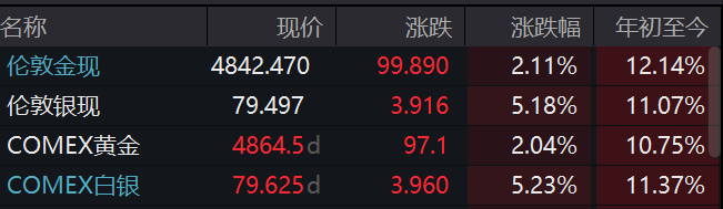 贵金属价格回升,金价重返4800美元/盎司上方。截至北京时间4月15日5:56,伦敦现货黄金报4842.47美元/盎司,涨2.11%;COMEX黄金期货报4864.5美元/盎司,涨2.04%。伦敦现货白银涨5.18%,COMEX白银期货涨5.23%。