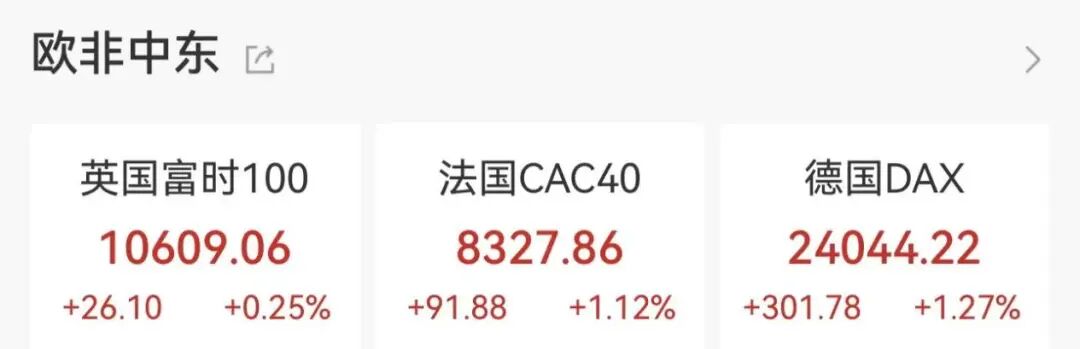 欧洲三大股指亦集体收涨。英国富时100指数收涨0.25%,报10609.06点;德国DAX 30指数收涨1.27%,报24044.22点;法国CAC 40指数收涨1.12%,报8327.86点。