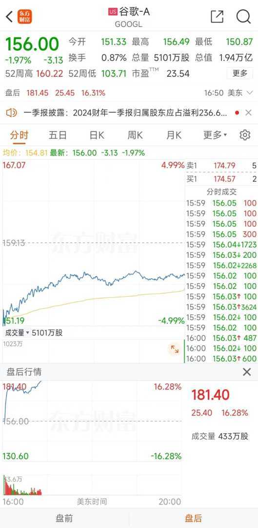 Alphabet第一财季财报显示,公司营收、经营利润、广告营收等均超出市场预期,谷歌美股盘后交易时段内股价强势上涨超过16%。
