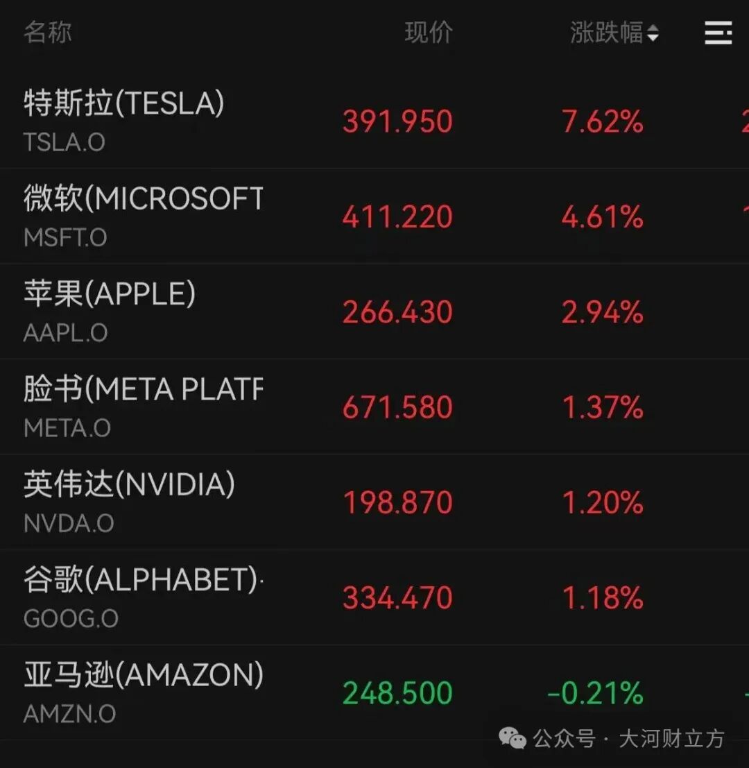大型科技股普涨,特斯拉涨超7%,微软、博通涨超4%,苹果涨近3%,英伟达、谷歌、Meta涨超1%。