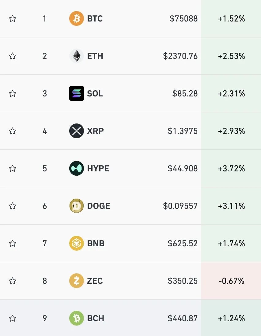 加密货币集体大涨,比特币冲上75000美元,日内涨超1.5%,以太坊涨超2.5%,狗狗币涨超3%。