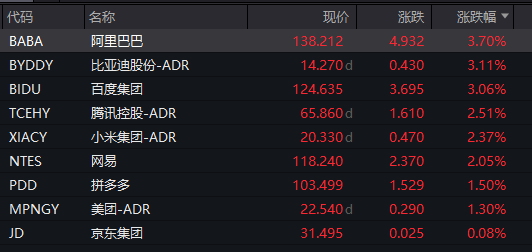 中概科技龙头股中,阿里巴巴、比亚迪股份ADR、百度集团涨超3%,腾讯控股ADR、小米集团ADR、网易涨超2%。