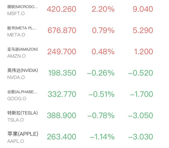 明星科技股分化,微软涨2.20%,Meta涨0.79%,亚马逊涨0.48%,英伟达、谷歌、特斯拉、苹果收跌。