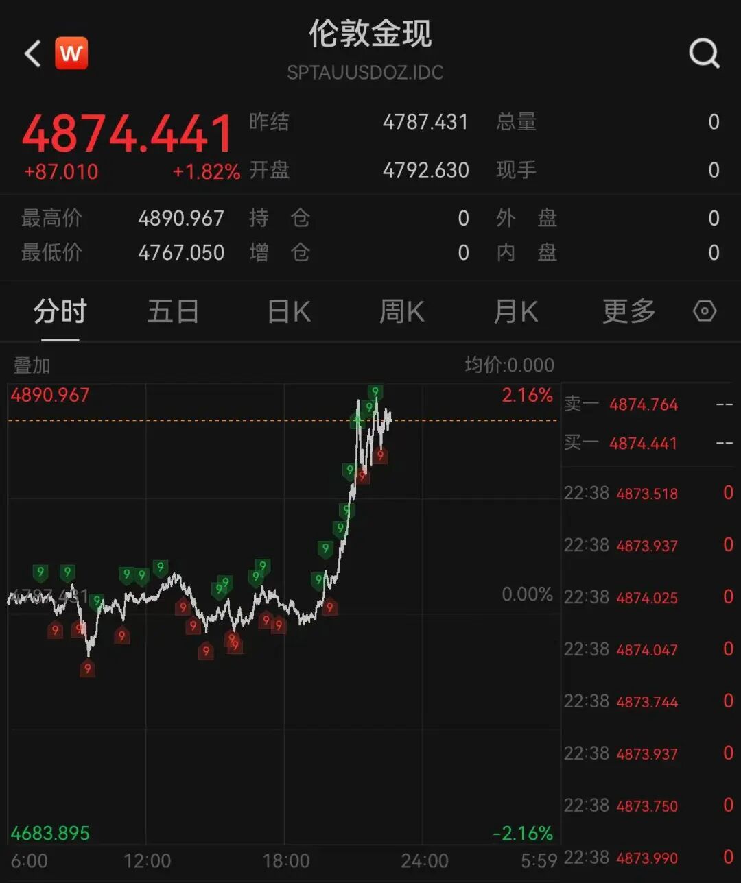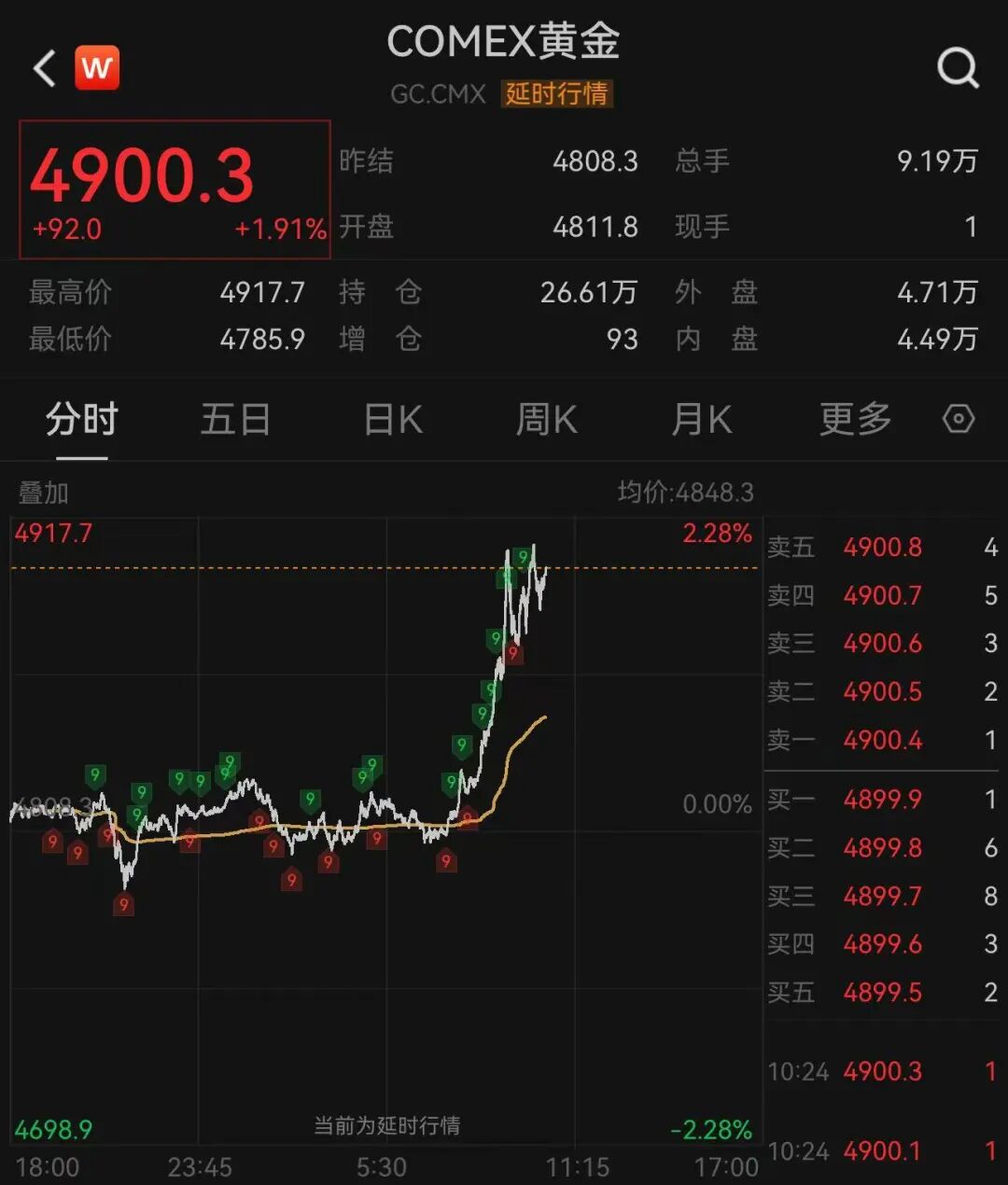 与此同时,国际金价、银价大幅上涨。现货黄金、COMEX黄金期货双双涨近2%,COMEX黄金期货站上4900美元/盎司;COMEX白银期货、现货白银均涨超5%,双双突破82美元/盎司。