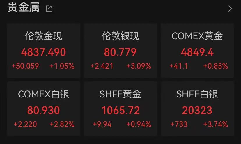 贵金属价格强势上涨。4月17日,伦敦现货黄金涨1.05%,报4837.49美元/盎司,本周累计上涨1.91%。COMEX黄金期货涨0.85%,报4849.4美元/盎司,本周累涨1.3%。