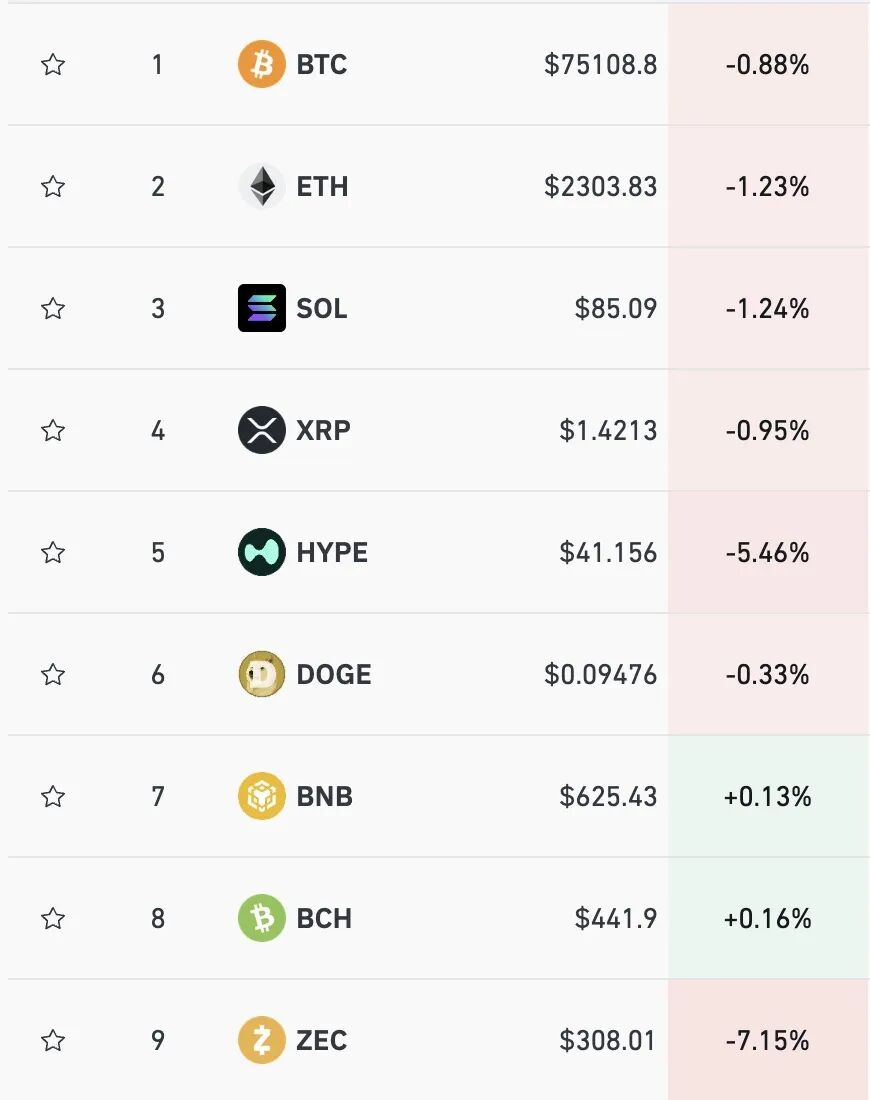 加密货币多数下跌。比特币报75108美元/枚,跌0.88%。以太坊跌1.23%,SOL跌1.24%,ZEC跌超7%。最近24小时,全球共有14.6万人被爆仓,爆仓总金额为4.14亿美元。