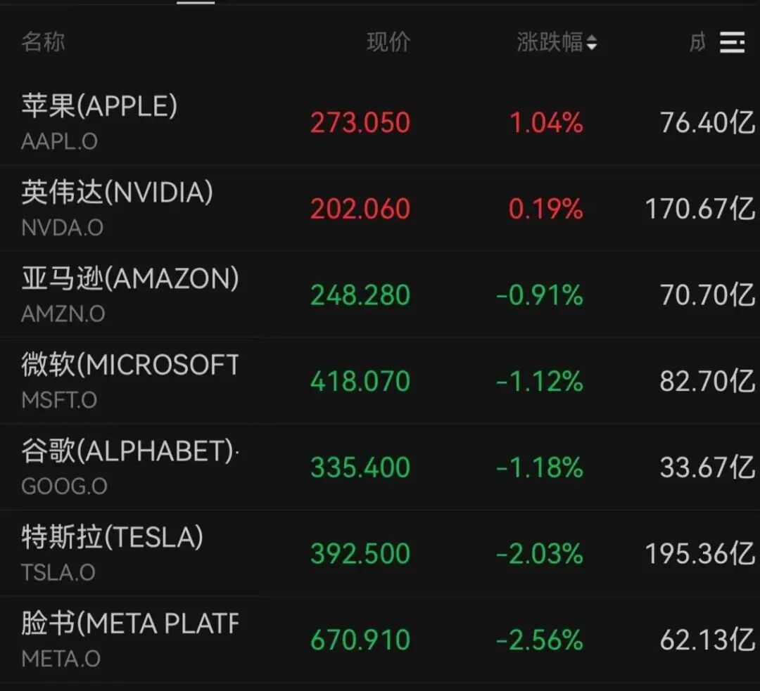 美股科技“七巨头”多数下跌。特斯拉下跌2.03%,Meta下跌2.56%,微软下跌1.12%,谷歌下跌1.18%。