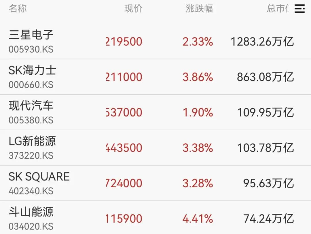权重股方面,三星电子、SK海力士、LG新能源等纷纷走高。