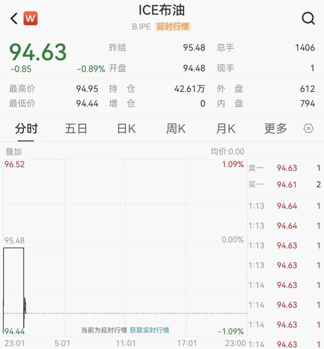 此外,原油期货开盘走低,布伦特原油一度跌超1%,现报94.63美元/桶。