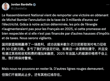 为应对危机,巴尼耶已向“国民联盟”做出妥协,但极右翼仍认为其力度不够。最新消息显示,在巴尼耶放弃在财政案中提高电力税后,“国民联盟”主席乔丹·巴尔德拉宣布“胜利”,但强调还有其他要求,包括放弃减少医保药物报销、暂停设立新税种或提高税率、明年1月1日起将养老金与通胀挂钩,以及对移民和犯罪采取更严格政策。