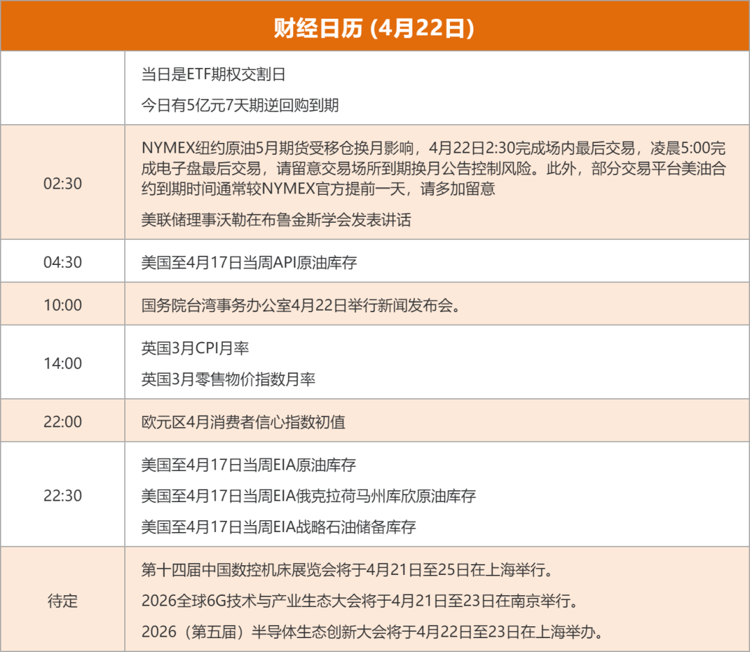 1、中债:4月21日,利率市场收益率多数下行,1Y国债下行2bp至1.14%,3Y国债下行1.5bp至1.31%,5Y国债下行1bp至1.49%,10Y国债下行1.4bp至1.74%,30Y国债下行2.1bp至2.23%,10Y国开下行0.1bp至1.86%。信用市场收益率多数下行,2Y期AAA信用债下行1.75bp至1.53%,3Y期AAA信用债下行1bp至1.77%,5Y期AAA信用债下行0.75bp至1.96%。转债方面,中证转债指数收盘报514点,收跌0.36%。
