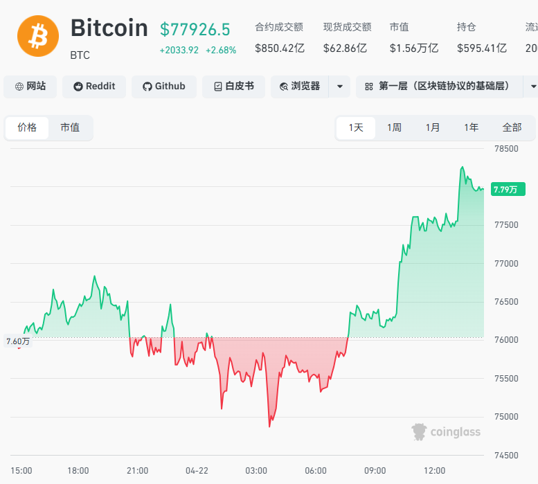 加密货币集体大涨,比特币一度升破78000美元,目前日内涨近3%。以太坊升破2400美元,日内涨约3%。截至发稿全球加密货币市场近11万人被爆仓,其中多为空单爆仓。