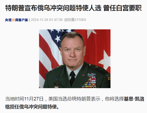 据央视新闻11月28日报道,当地时间11月27日,美国当选总统特朗普宣布,他将任命退役美国陆军中将基思·凯洛格为俄乌冲突问题特使。凯洛格曾在特朗普的前任期内担任白宫国家安全委员会幕僚长,并兼任副总统彭斯的国家安全顾问。