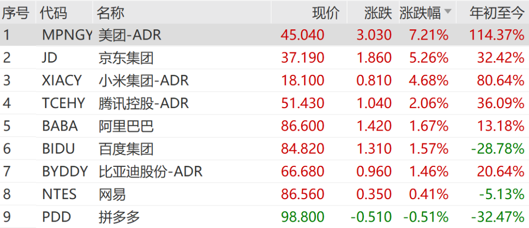 与此相反,中国资产在全球市场中表现出色,纳斯达克中国金龙指数大涨2.82%,万得中概科技龙头指数最高涨幅更是达到3.08%,最终收涨2.43%。其中,美团涨幅最大,一度达到7.60%,最终收于45.04美元,涨幅7.21%。此外,京东、小米、腾讯等科技巨头也纷纷大涨,在万得中概科技龙头指数成份股中涨幅居前。