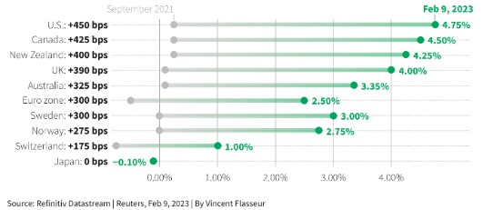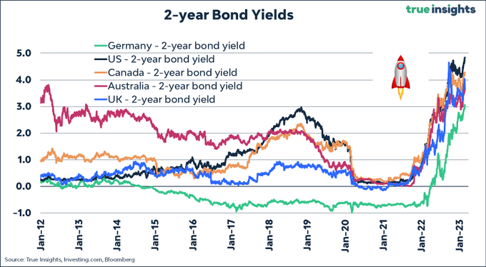 短债收益率的飙升,反映了市场对央行利率变动的预期。一系列强劲的经济数据支持着人们的预期,即美联储和全球其他主要央行可能需要更高的利率来对抗顽固的高通胀。这一背景下,全球抗通胀战役的战况备受关注。