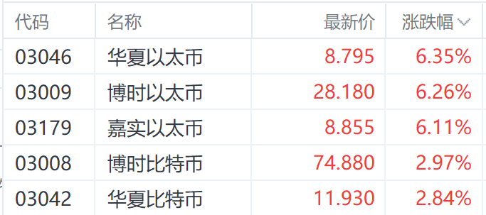 同期的数字货币ETF也呈现上涨趋势。华夏以太币(03046.HK)、博时以太币(03009.HK)、嘉定以太币(03179.HK)分别上涨6.35%、6.26%、6.11%。附图展示了港股加密货币ETF的表现。