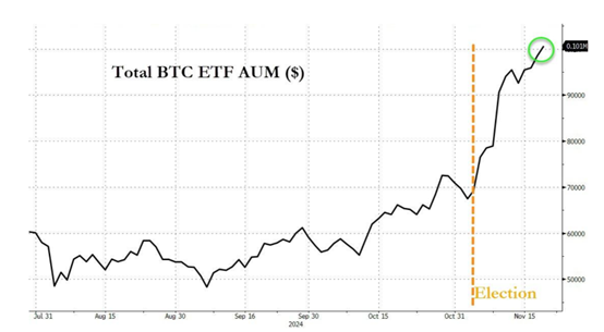 此外,比特币ETF的资产管理规模也达到了重要里程碑。随着比特币价格不断创下新高,直接投资比特币的美国交易所交易基金(ETF)的资产管理规模在本周四首次超过1000亿美元。附图展示了比特币ETF资产管理规模的变化。