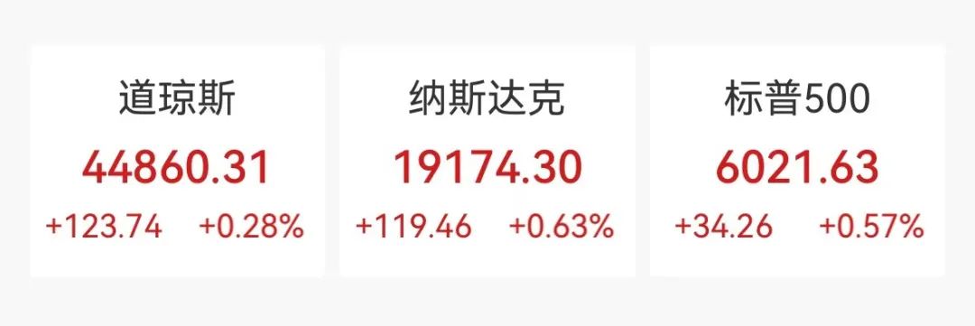 美股方面,截至收盘,道琼斯指数收涨0.28%,报44860.31点;标普500指数涨0.57%,报6021.63点;纳斯达克综合指数涨0.63%,报19174.30点。市场整体呈现上涨态势。