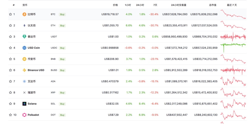 然而,在两次跌破18000美元后,比特币在6月19日下午出现了反转态势。截至18时30分,比特币报19718.57美元,24小时涨幅为1.8%,但近7天跌幅仍高达30.4%。以太坊也报1055.70美元,24小时涨幅为4.6%,近7天跌幅为30.7%。