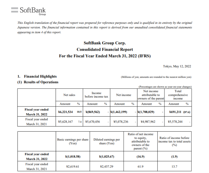 5月12日,软银集团揭晓了2021财年(涵盖2021年4月1日至2022年3月31日)的年度财报。财报数据显示,该财年软银集团净亏损额高达1.7万亿日元(折合约131.2亿美元,或899亿元人民币),创下了其四十年经营史上的最大年度亏损纪录。这一巨额亏损主要源于集团旗下负责投资业务的愿景基金,其亏损额更是达到了2.64万亿日元(约262亿美元,1397亿元人民币)。相比之下,上一财年软银还实现了近5万亿日元(约390亿美元)的净利润。