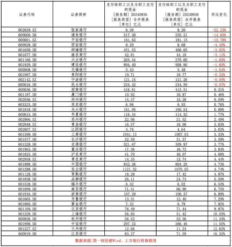 然而,尽管行业正面临着降本减薪的调整,但仍有多家银行薪酬支出呈现增长态势。据统计,前三季度有30家上市银行维持正增长,其中江苏银行、兰州银行、杭州银行和上海银行等上市城商行薪酬支出增幅位居前列,均超过10%。