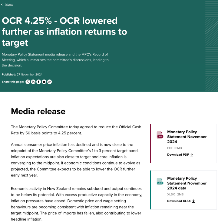 11月27日,新西兰央行宣布再次降息50个基点,将基准利率从4.75%下调至4.25%。这是新西兰央行自今年8月以来的第三次降息。新西兰联储主席奥尔表示,政策委员会可以在任何时候召开会议,如有必要将继续降息,并预测明年2月还将进一步降息50个基点。这一举措旨在缓解国内通胀压力,使通胀预期与货币政策委员会设定的1%至3%目标区间保持一致。