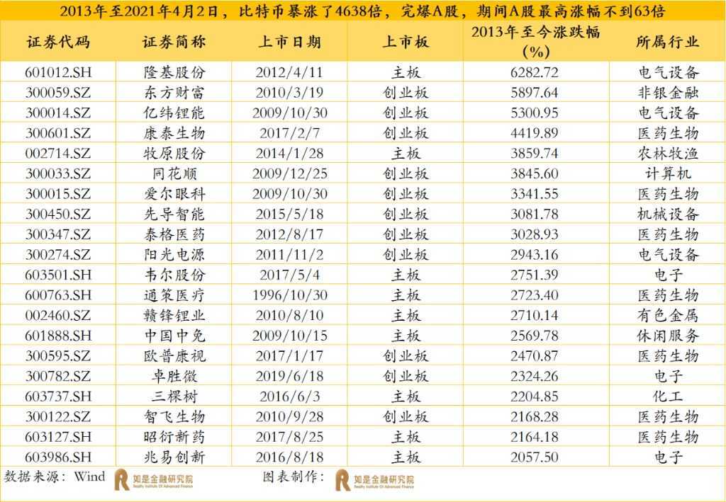 从2013年至2021年4月2日,比特币暴涨了4638倍,成为了一个造富神话。而在这个时间段内,A股市场中涨幅最大的股票是隆基股份,累计涨幅约63倍;东方财富、亿纬锂能涨幅均超过50倍。但值得注意的是,A股市场自2013年至今仅有20只个股涨幅超过20倍。