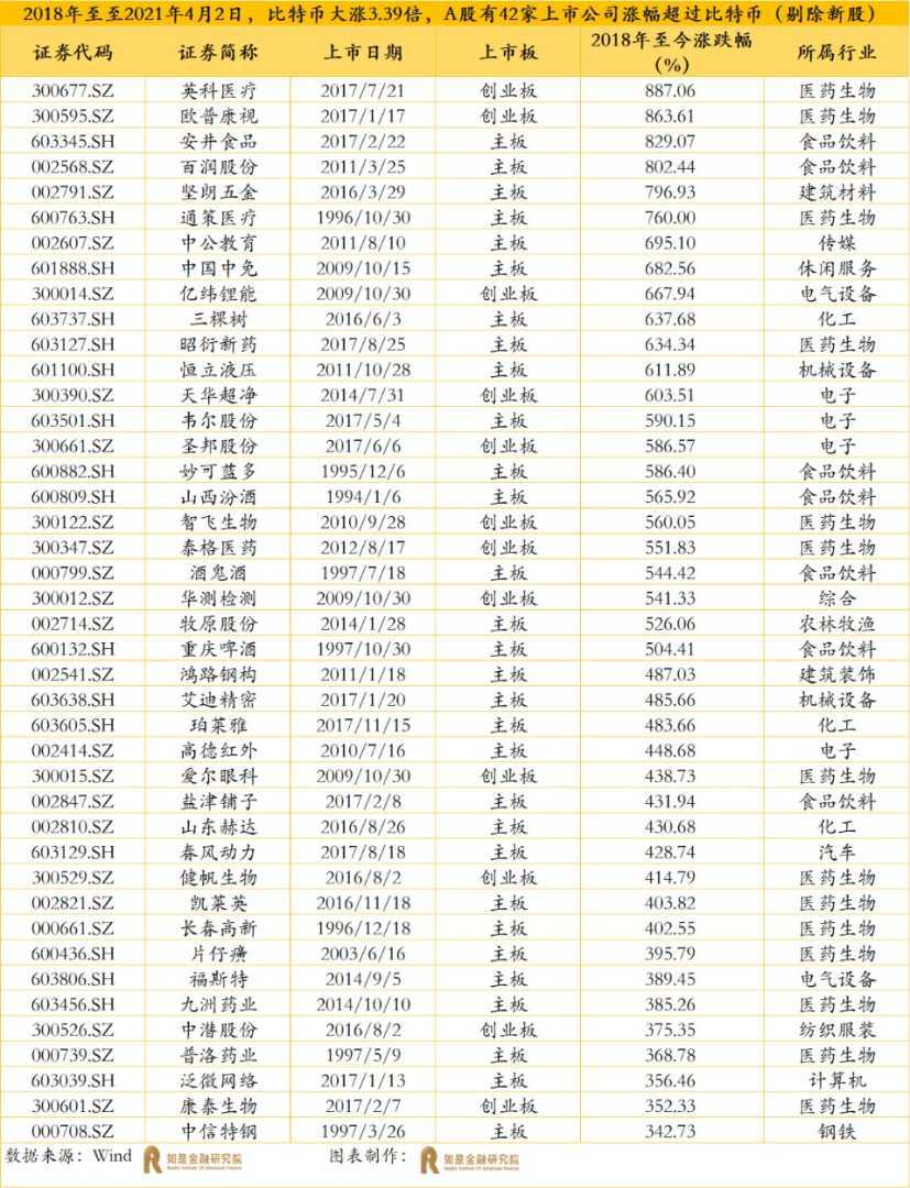 从2018年至2021年4月2日,比特币累计涨幅超过3倍,表现远胜于98%的A股上市公司。在这个时间段内,比特币逐渐被主流市场认可,累计大涨3.39倍。而在这个时间段内,A股市场中仅有73只股票跑赢比特币,剔除新股后,共有42只个股涨幅超过比特币。