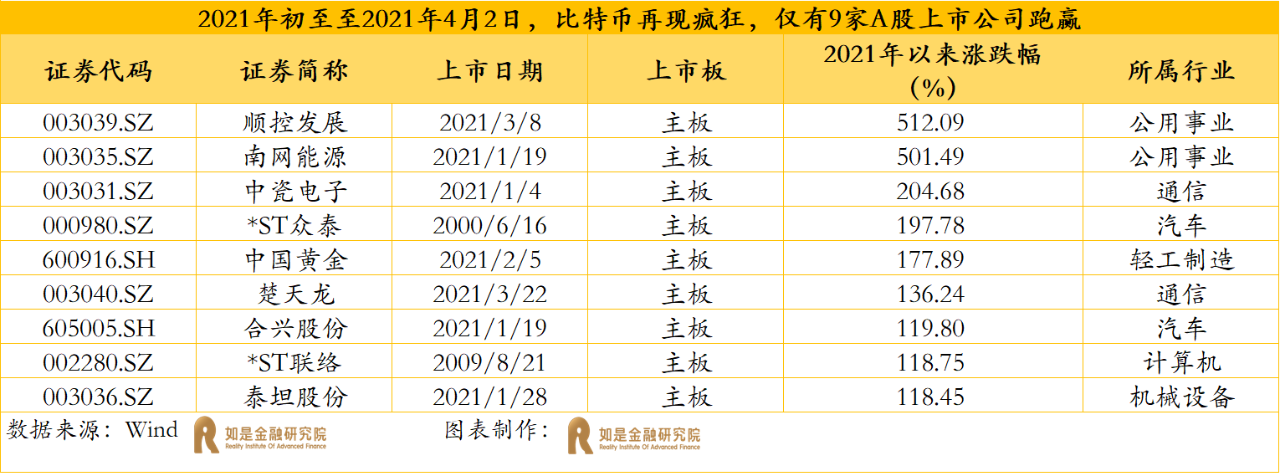 从2021年初到4月2日,比特币再次疯狂上涨,突破6万美元创下历史新高,涨幅高达110%。而在这个时间段内,由于国内货币政策边际收紧,A股市场出现了明显的调整,仅有9家上市公司涨幅超过比特币,其中7只是新股,剩下的2只都是ST股票。